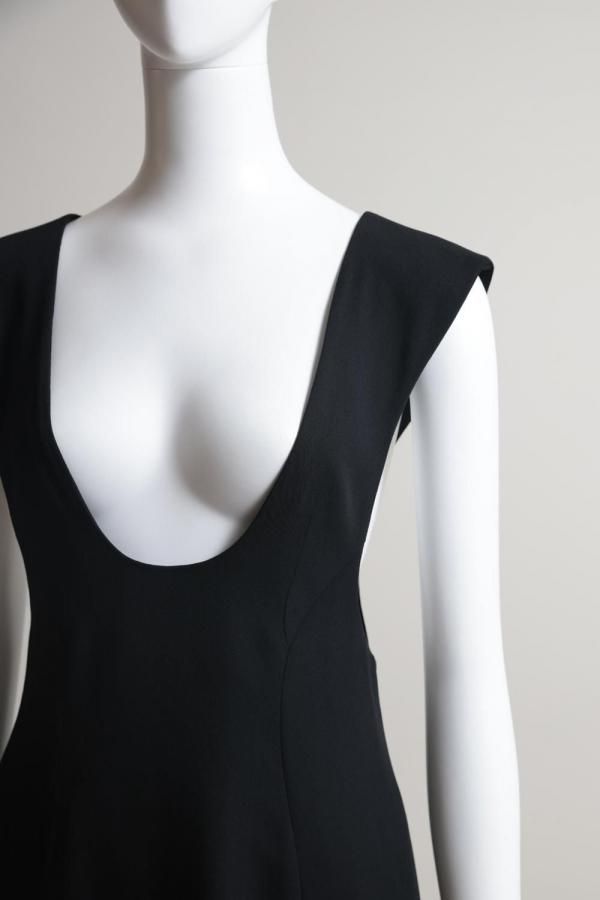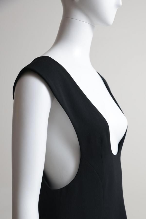 禁欲的なバックスタイルと対照的に深く開いたフロントは、