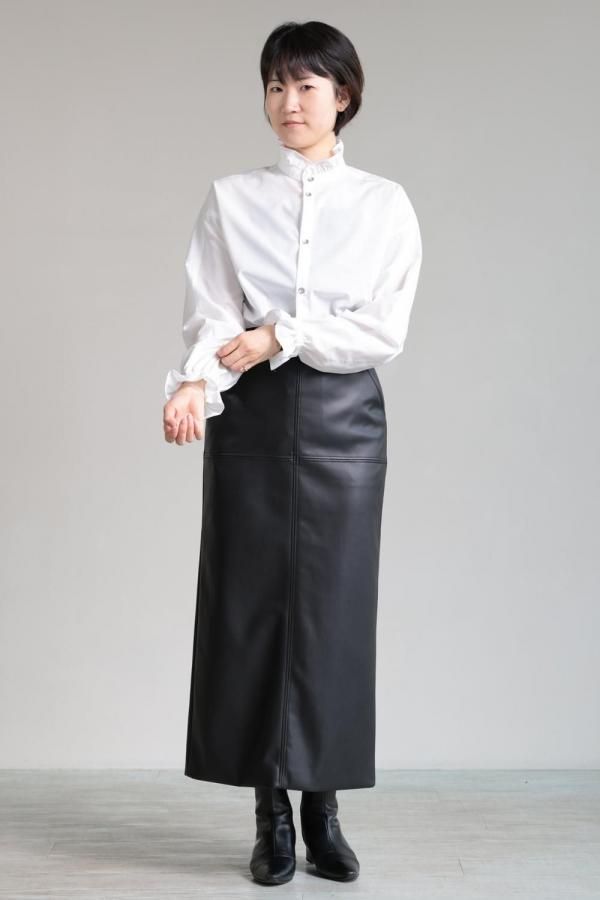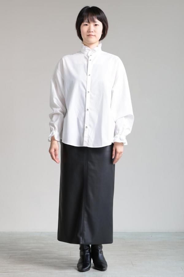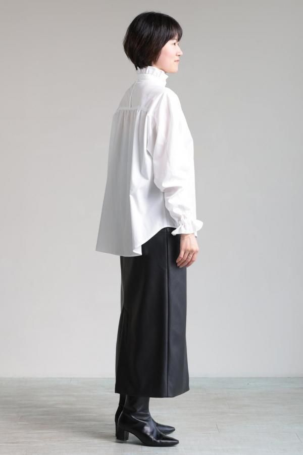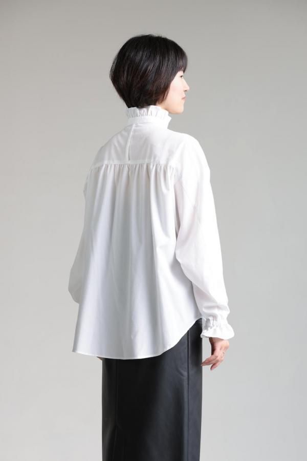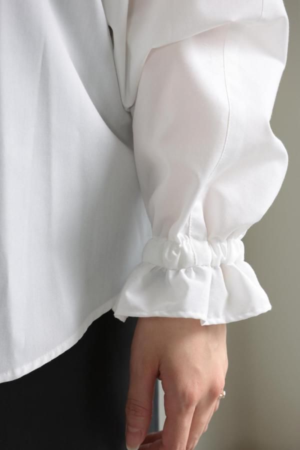 襟と袖口のギャザーフリルがポイントのシャツ。