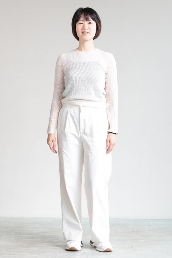 ゆとりを持たせつつも、ヒップ下からストンと落ちるストレートシルエットで