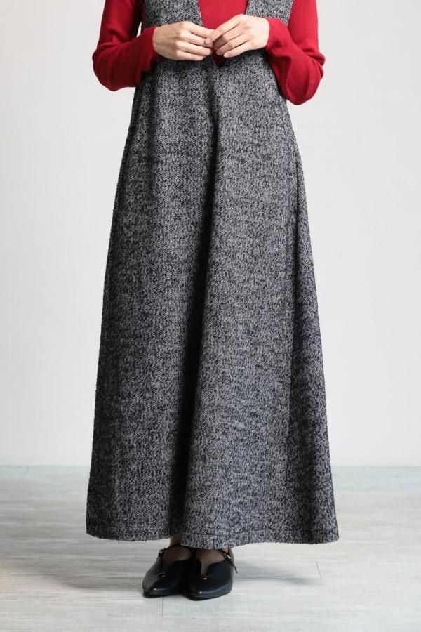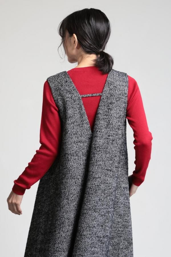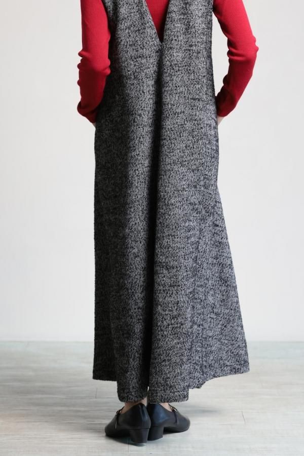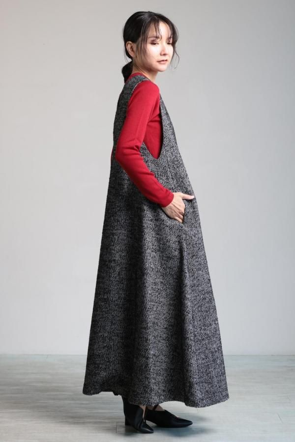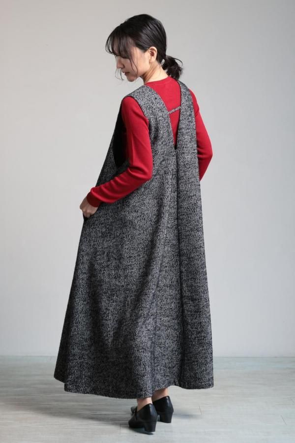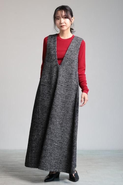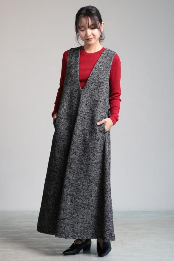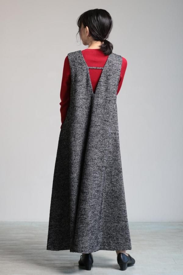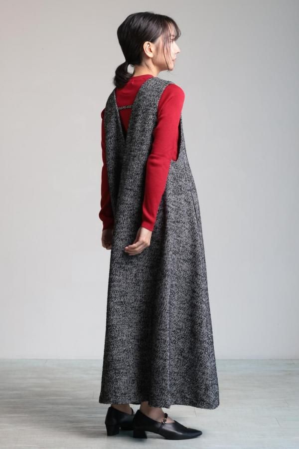 前後に深く開けたVネックが抜け感のあるジャンパースカートです。